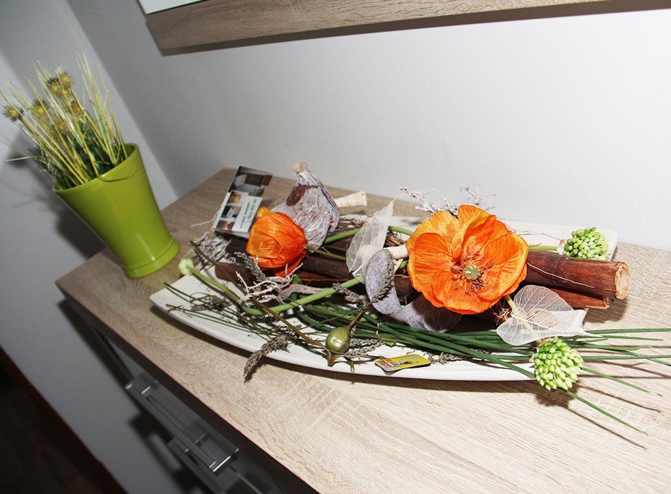 Das Wohnzimmer ist liebevoll eingerichtet und ausgestattet mit Ledercouchgarnitur und einem 90 cm Flachbildschirm und einer SAT-Anlage.